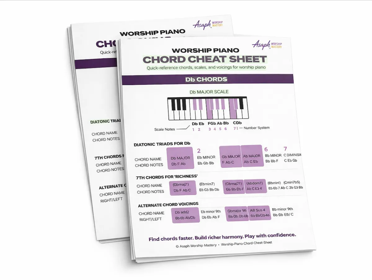 Worship Piano Cheat Sheet Bundle! This bundle, featuring the Diatonic Chords Breakdown and Chord Types Chart, expands your musical vocabulary so you can navigate chords effortlessly. With these tools, you’ll learn the essentials, broaden your chord knowledge, and speak the language of music with greater confidence and freedom during worship and beyond.